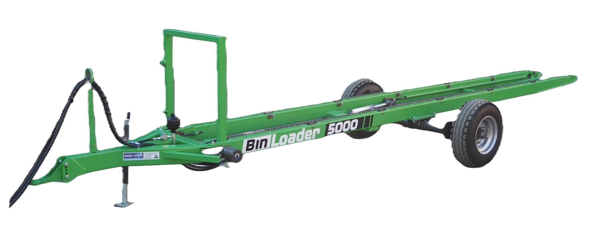 Ben Wye Bin Loaders are designed for fast and efficient transport of fruit bins, allowing operators to load and unload bins without leaving the tractor seat. Built with heavy-duty construction, these trailers use a fully hydraulic cam axle to lower the forks under standard fruit bins. Bi-directional hydraulically driven roller chains then pull the bins onto the loader until it reaches maximum capacity. Unloading is just as seamless—simply reverse the process to transfer bins back to the packing shed.